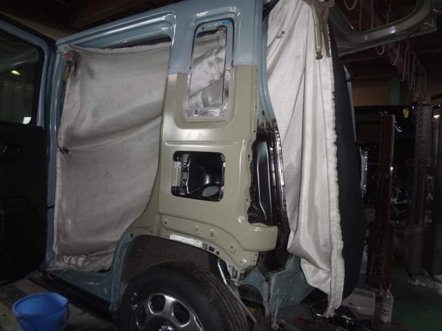 フレーム修正機で引き出した後、クオーターパネルをカット交換しました。